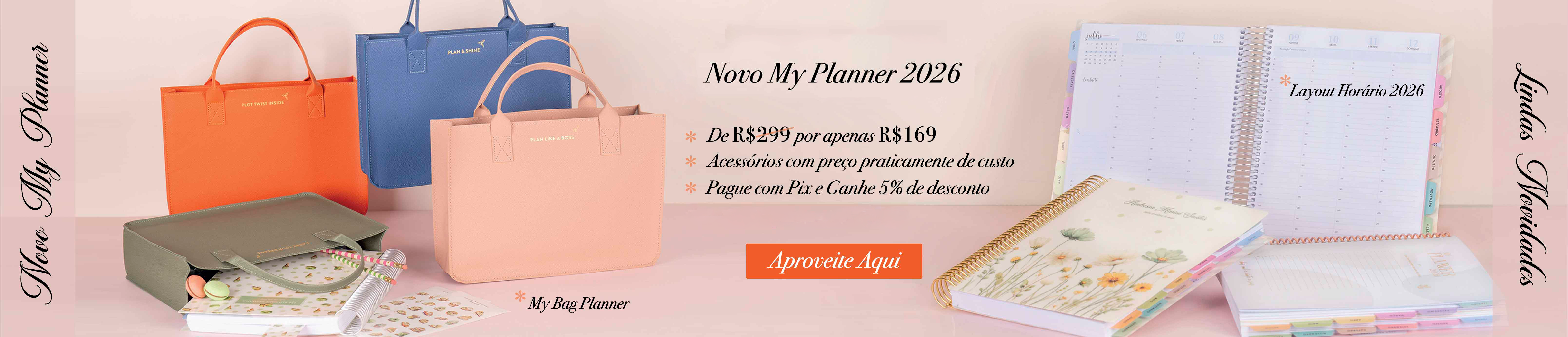 - Mantras em dourado: PLOT TWIST INSIDE, PLAN LIKE A BOSS, PLAN & SHINE, CARRY YOUR DREAMS