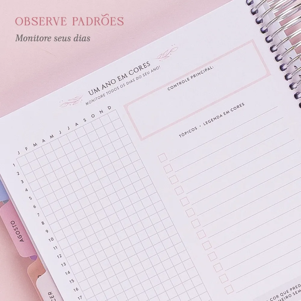 CONTROLES & CRIATIVIDADE: Um Ano em Cores — escolha um controle principal (saúde, estudos, conteúdo, finanças) e defina uma legenda de cores para monitorar visualmente o que importa. Página Mini Graph — espaço para gráficos rápidos, estatísticas pessoais e análises. Lembrete da página: "o rascunho é a obra." Páginas Dot Grid — livres para colorir, planejar, colar memórias, desenhar e prototipar ideias.